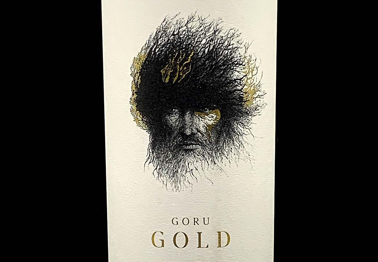 This striking portrait of Goru fronts several wines from Ego Bodegas. Floating in a sea of white space, it commands attention. The Goru Gold is the most minimal label in the line. It distinguishes itself with metallic gold accents on the character’s cheekbones and wisps of his bristly hair.