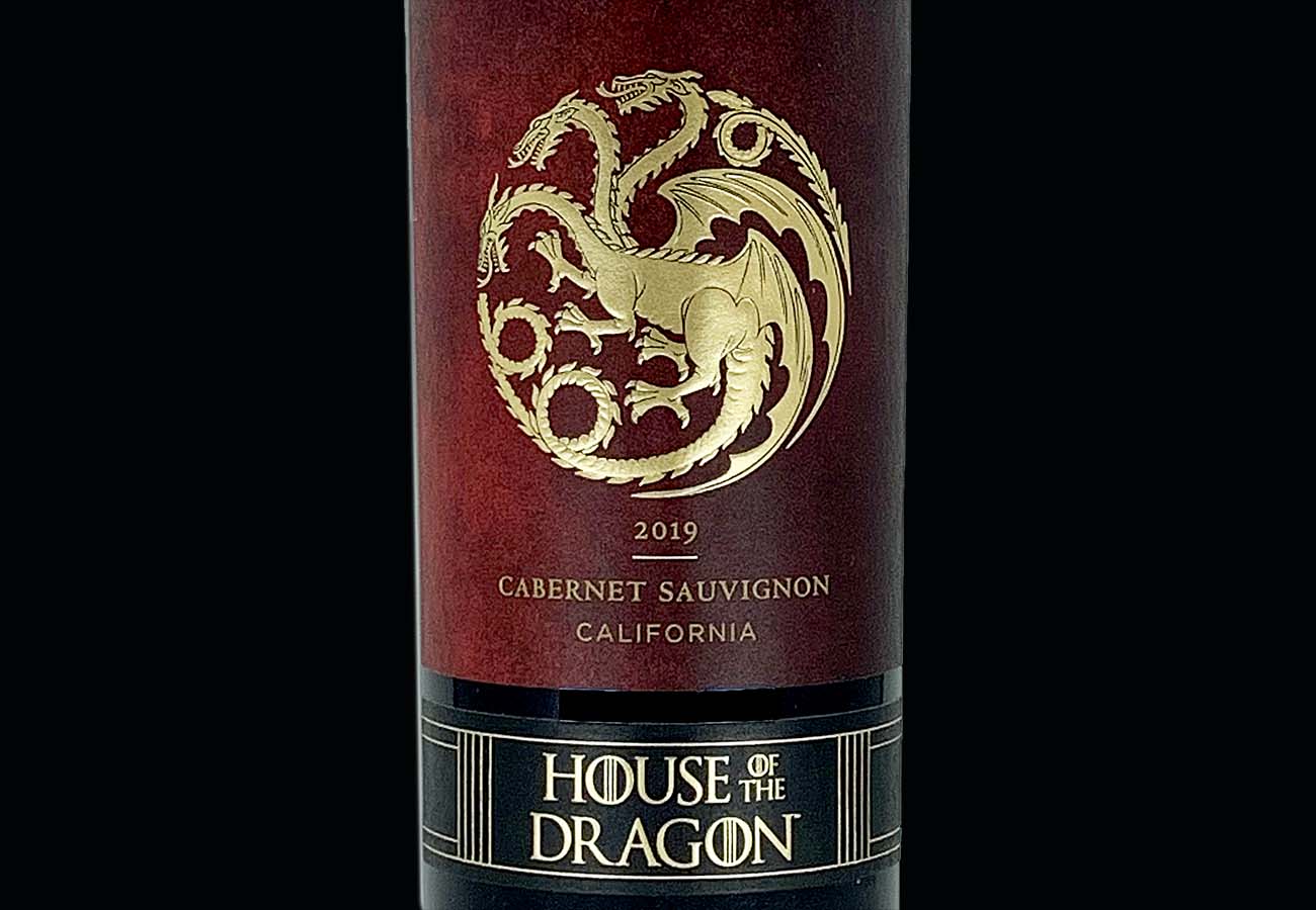 This is premium packaging. The overall impression is opulent, masculine, dark, and brooding. It represents the brand very well. The background of the Cabernet Sauvignon is a textured graduation of luscious, deep reds. It is emblazoned with a metallic gold House Targaryen three-headed dragon symbol. Stacked below that, in type of similar sizes, are the vintage, grape varietal, and state of origin. The House of the Dragon logo in gold on matte black plays a supporting role on a separate label underneath the main panel.