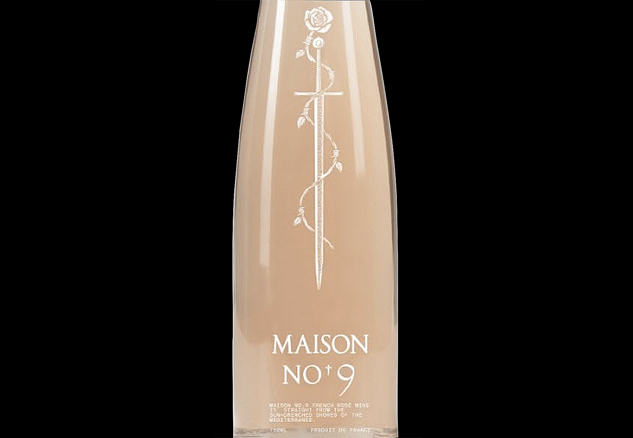 It’s a sexy package. The bottle is extremely tall and sleek. No labels. The minimal graphics are screen-printed in white allowing the pale pink wine to blush through the glass. Working well with the slender bottle is a sword entangled in a vine with a single rose bloom at the top. Although the vine sprouts a few spare leaves, a closer look reveals it is actually barbed wire. Underneath the sword is the wine name, Maison No. 9. The abbreviation period is replaced with a sword which may also be a cross.