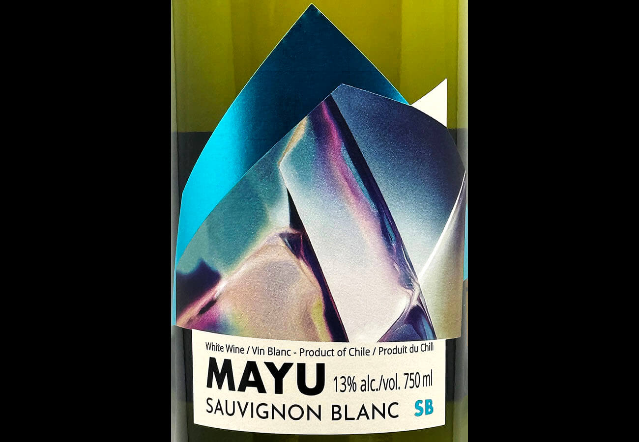 The Mayu Sauvignon Blanc label employs the “shiny object” tactic. The abstract artwork is literally a shiny object. It appears to be mountains of sparkling crystal accented with metallic blue foil. Very shiny and a plausible metaphor for a wine region. If only that were the inspiration.