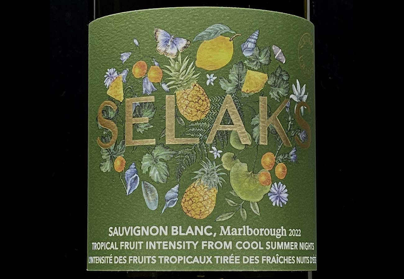 Two other elements of interest give this package an air of sophistication. The dark, mossy green background of the label is very on-trend right now. The brand name Selaks set large, in gold with a modern sans serif typeface is strong and distinct. The look is unique amongst competitors in the NZ SB category.