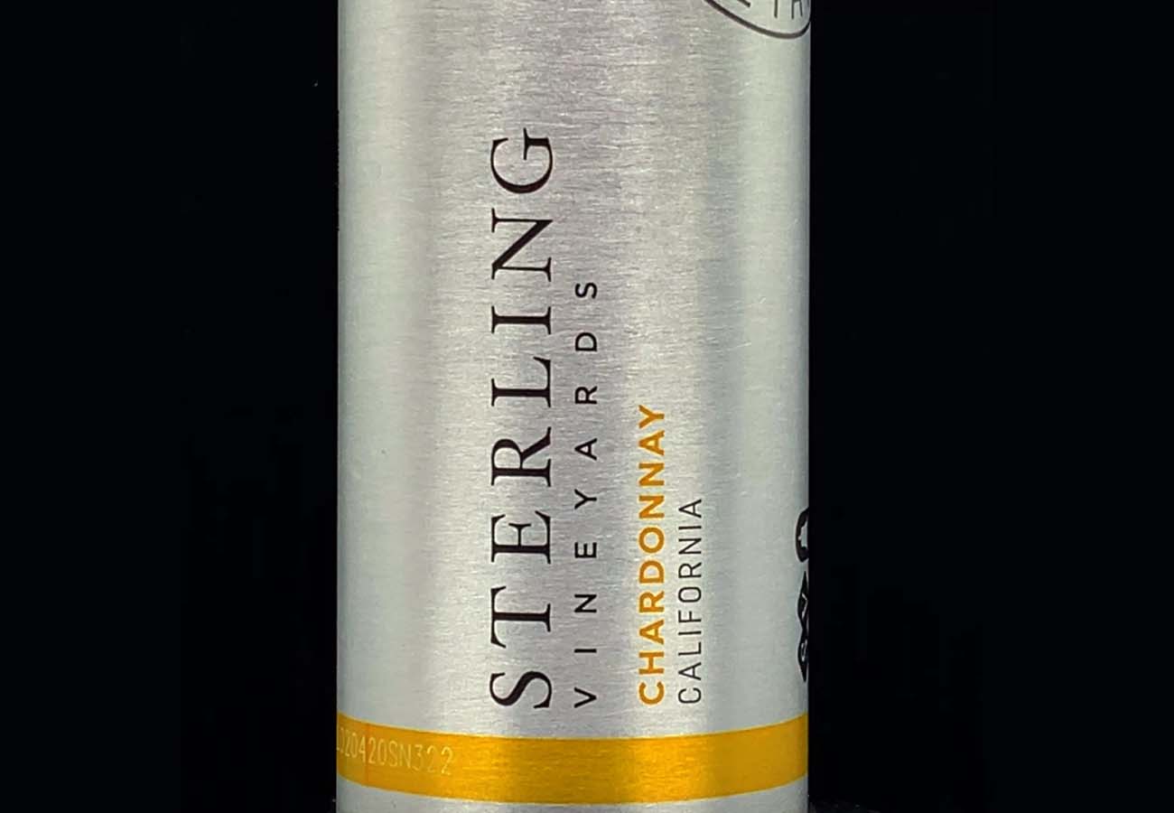 The graphic design is a bold departure for Sterling as well. It is modern and minimal with primarily typographic elements printed in black—most of it reading vertically—on the natural aluminum background. A retro Sterling Vineyards badge design is printed on both the bottle and on top of the cap. The Chardonnay is one of three wines offered in this product line that also includes a Cabernet Sauvignon and Rosé. Each has a related colour accent for its cap and stripe at the bottom of the bottle. Gold for the Chardonnay.