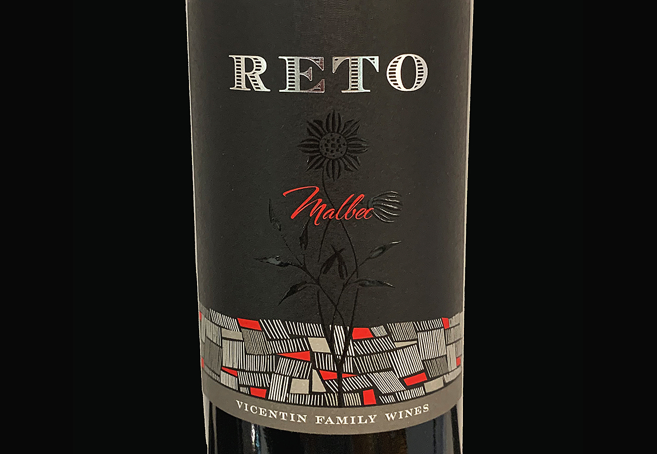 There are several notable aspects of this wine label. Let’s start at the top. The name RETO is set in a classic banknote typeface. For whatever reason, this typeface is extremely popular in wine and spirits packaging. I’ve used it myself. Silver foil makes the name pop against the matte black background.